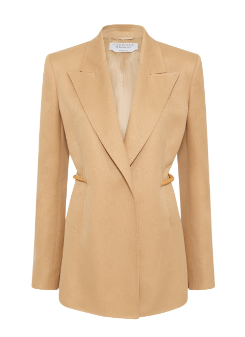 Linen blazer suiting with a signature bold gold chain threaded through the waistline and partly covered in tonal leather.